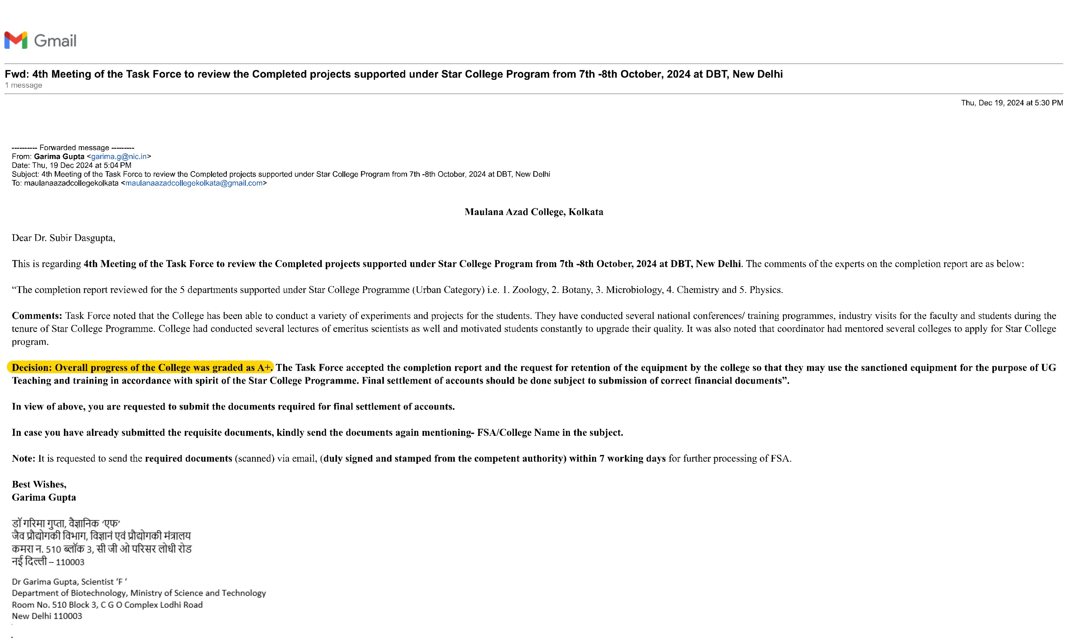 Maulana Azad College has proudly achieved an A+ grading under the DBT Star College Program, awarded by the Department of Biotechnology, Ministry of Science and Technology.