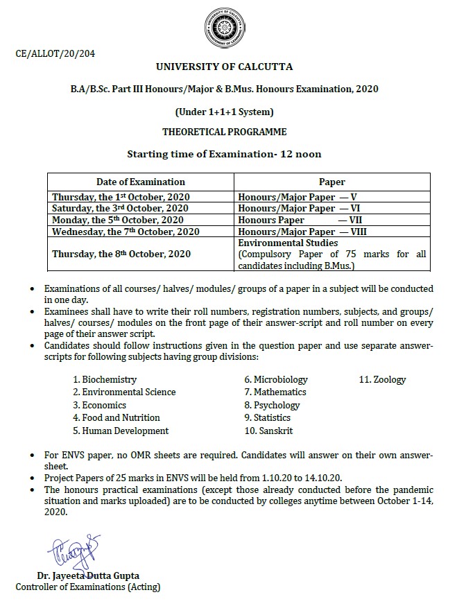 CU Notice-Online B.A/B.Sc. Part III Honours/Major Examination, 2020