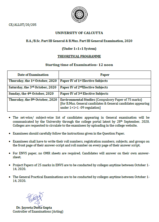 CU Notice-Online B.A./B.Sc. Part III General Examination, 2020
