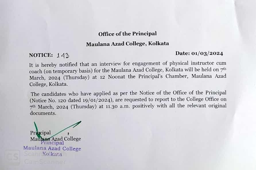 Notice: Schedule of Interview: Engagement of Physical Instructure cum Coach