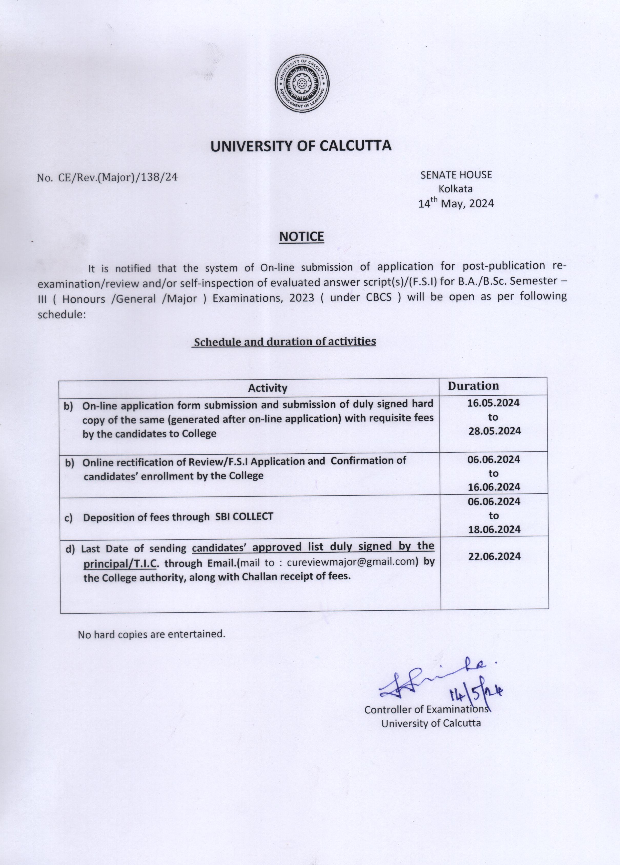 Notice for online submission of application for Re-Examination/FSI for B.A./B.Sc.Semester-III (Honours/General/Major) Examinations,2023(Under CBCS).